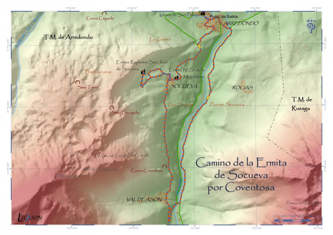 Durante la subida hacia la población de Socueva, encontramos un viento fresco, que nos indica la entrada de la cueva Coventosa. Esta cueva excavada dentro del macizo Peña Lavalle, forma parte del sistema Cueva Coventosa - Sima del Cueto - Cueva de Cubera. Coventosa es la segunda cavidad más importante de Cantabria y la tercera de España. Se abre en el flanco oriental de Alto de la Rasa, tiene más de 800 m. de profundidad, un pozo vertical superior a los 300 m. y un desarrollo total que supera los 32 km. Entre las salas más importantes se encuentra la sala de los fantasmas. Prosigue el ascenso en dirección a la Ermita de San Juan de Socueva, la vegetación vuelve a diferenciarse apareciendo especies más características del clima mediterráneo, estos son el labiérnago, el aladierno, o el laurel, en las praderías adyacentes se observan especies de gramíneas como Poa sp, Festuca sp., etc. y asteráceas como la margarita (Bellis sp) o el diente de león (Taraxacum sp).