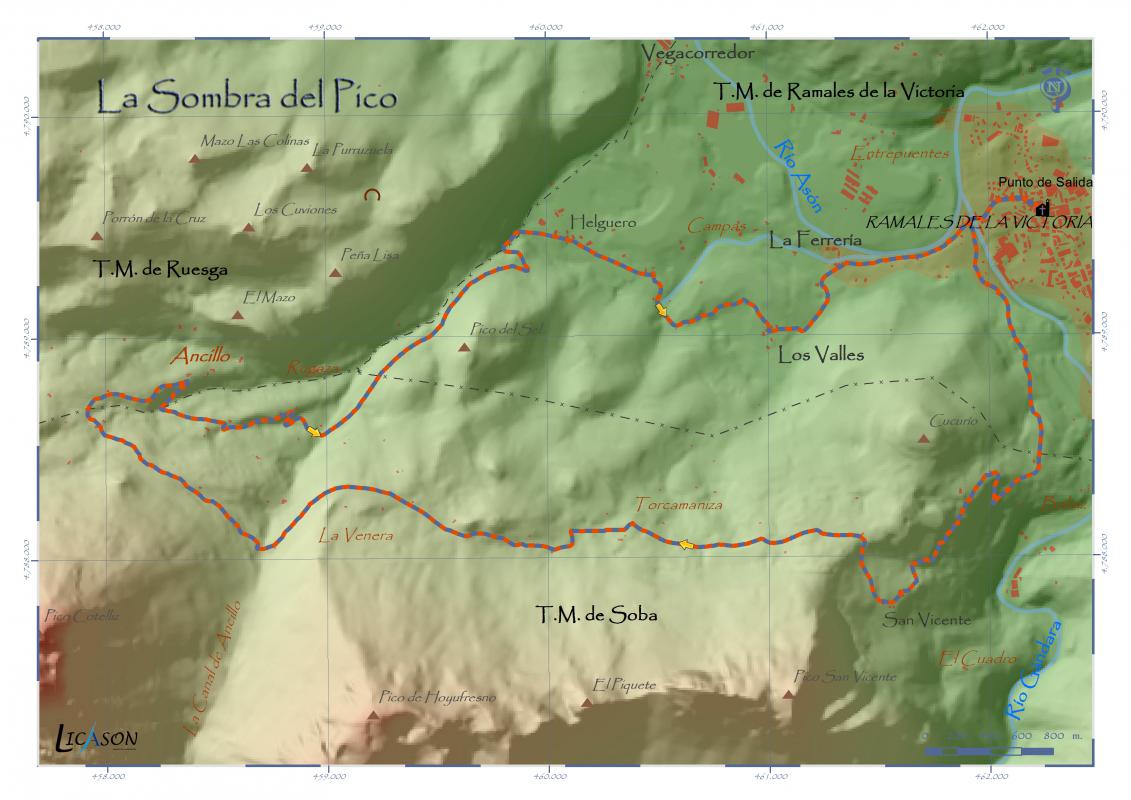 La ruta comienza en la plaza de los Duques de la Victoria, de Ramales de la Victoria. Este municipio está incluido dentro de la Mancomunidad del Alto Asón, e incluye parte del LIC Río Asón. Durante el recorrido, pasaremos por el Bº San Vicente y Ancillo del municipio de Soba, Helguero y Los Valles del municipio de Ramales de la Victoria, además atravesaremos por Ruesga.